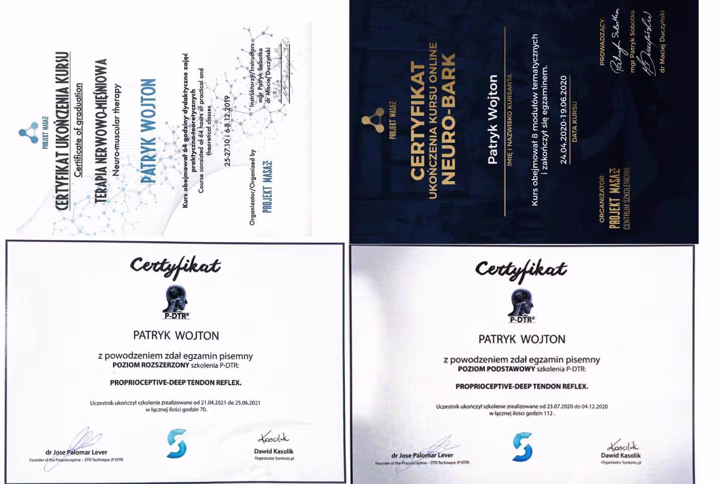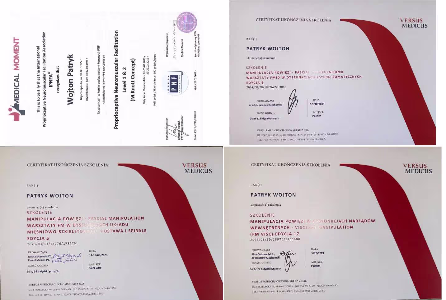 Od samego początku mojej przygody z fizjoterapią regularnie uczestniczę w specjalistycznych kursach i szkoleniach, stale poszerzając swoją wiedzę oraz umiejętności.